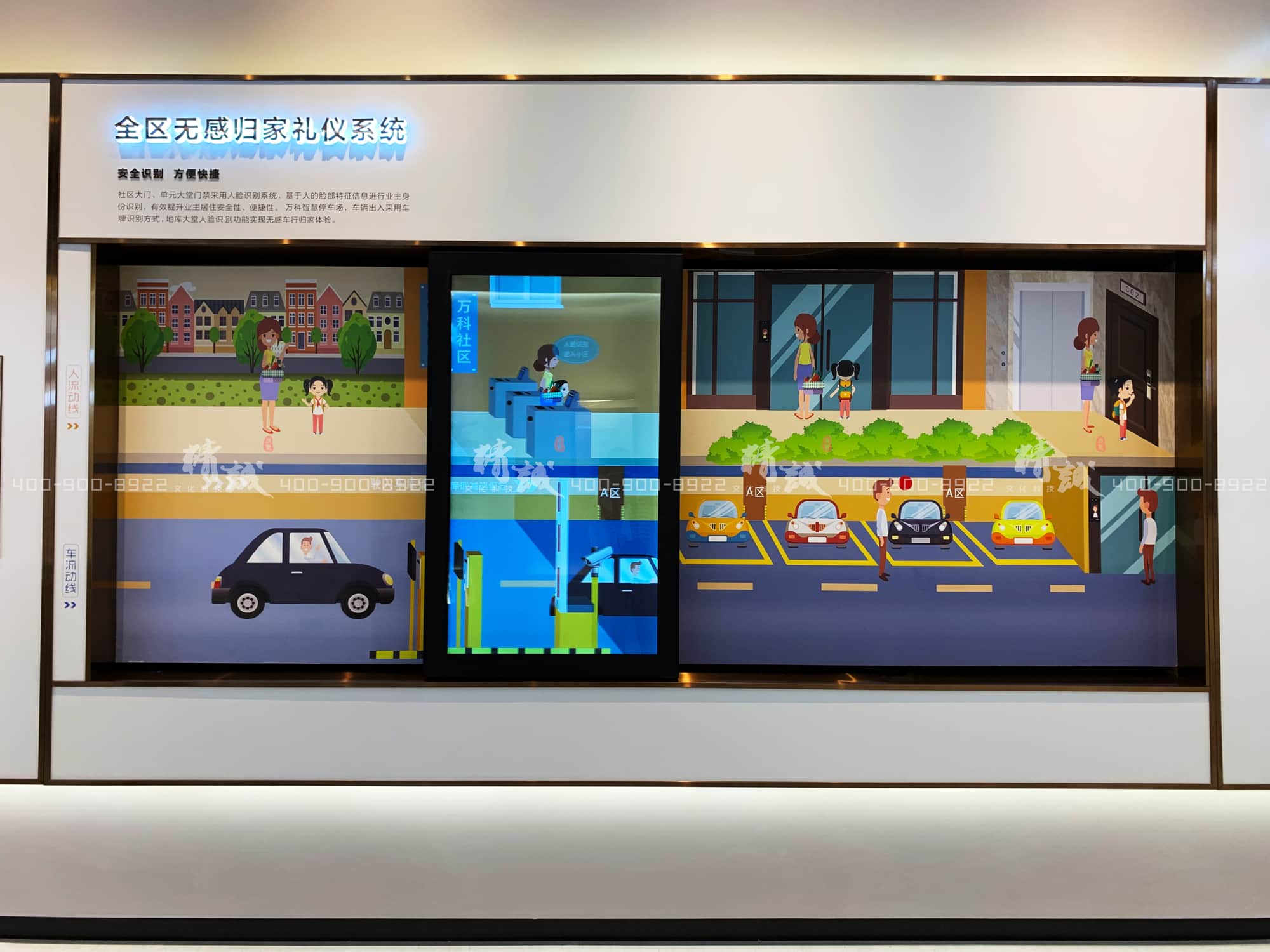 从触摸屏的社区日照系统展示,到人车分流的微缩场景,再到互动滑轨屏展示的全区无感归家礼仪系统。
