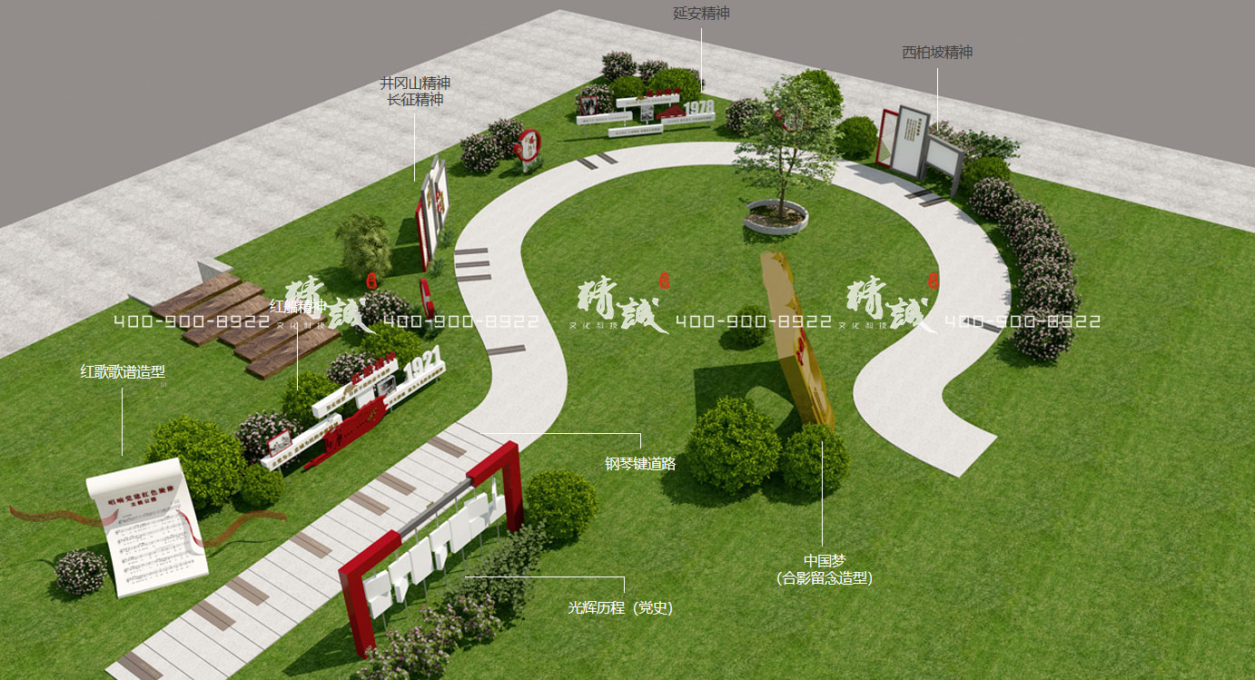 安康紫阳县党建主题公园主要展览了|红歌歌谱造型|红船精神|井冈山精神-长征精神|延安精神|西柏坡精神|钢琴键道路|光辉历程(党史)|中国梦(合影留念造型)|