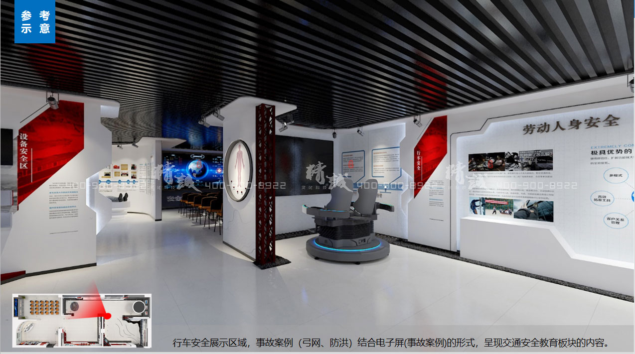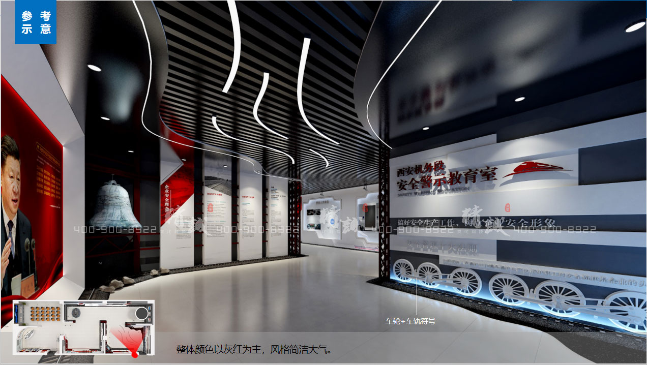 1. 安机务段安全警示教育室展厅整体颜色以灰红为主,风格简洁大气,顶部采用黑色铝方通,及动态造型灯带,增加展厅设计感,习总书记关于安全生产的讲话,在进入展厅伊始,拔高政治站位,提升思想高度,并通过敲响警钟,增加仪式感。交通安全展示区域,事故案例展示,结合交通安全知识答题。