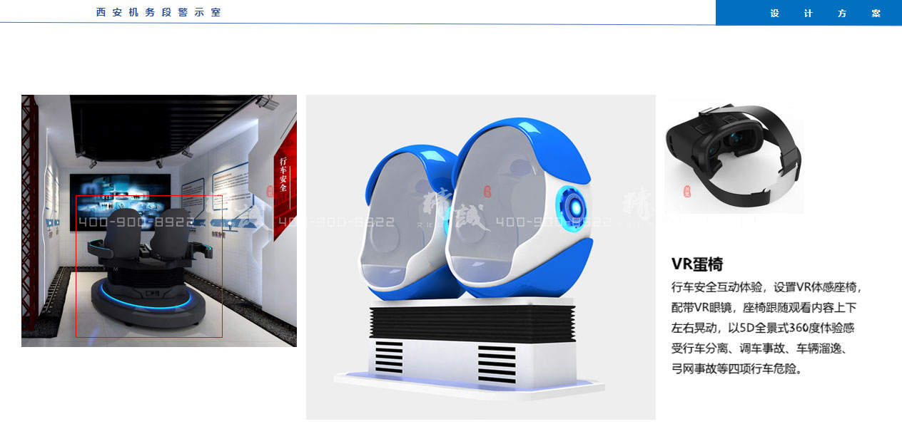 4.VR蛋椅:行车安全互动体验,设置VR体感座椅,配带VR眼镜,座椅跟随观看内容上下左右晃动,以5D全景式360度体验感受行车分离、调车事故、车辆溜逸、弓网事故等四项行车危险。