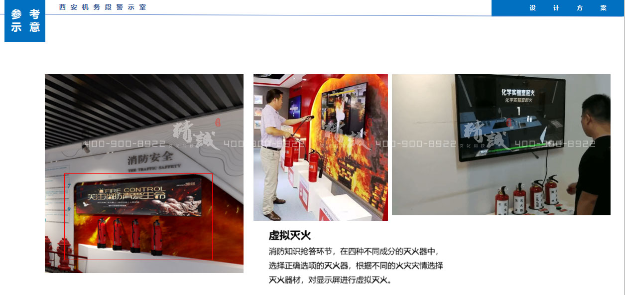 消防知识抢答环节,在四种不同成分的灭火器中,选择正确选项的灭火器,根据不同的火灾灾情选择灭火器材,对显示屏进行虚拟灭火。
