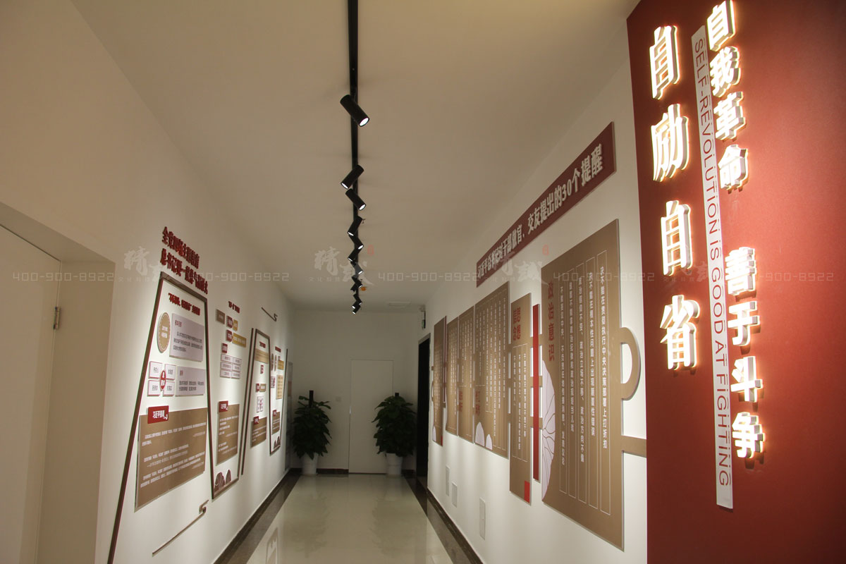 自励自省回廊以“自我革命、善于斗争”为主题,展示了党的十八大以来,中央开展的4场主题教育重点内容和习近平总书记关于干部做官交友的30个提醒。