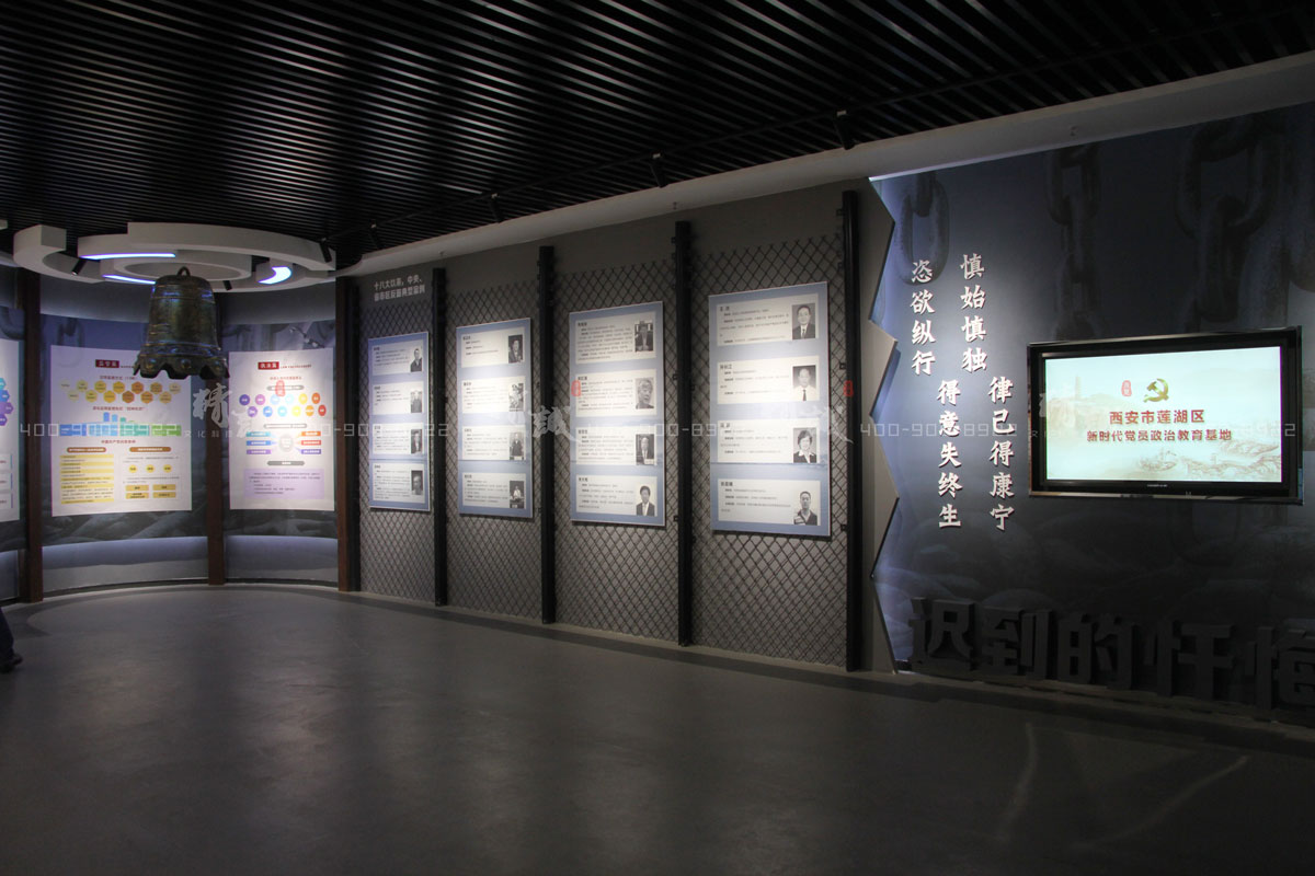 配合廉政警示教育,采用铁丝网造型墙和吊顶警钟设计,展示中央纪检监察机构历史沿革、莲湖纪检监察机构历史沿革以及十八大以来中省市区反面典型案例,从视觉感官层面引导广大党员干部自警自省,自重自律。