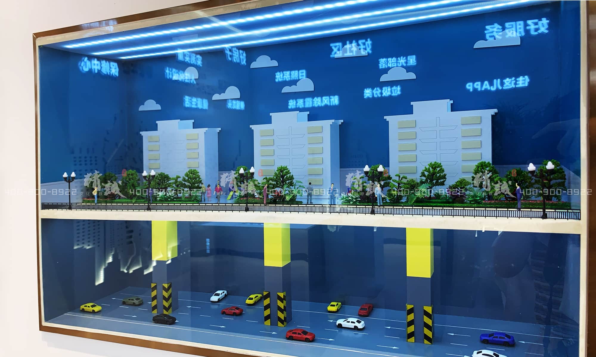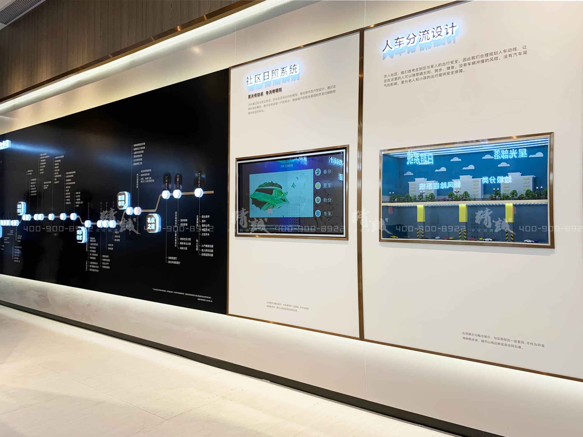 从触摸屏的社区日照系统展示,到人车分流的微缩场景,再到互动滑轨屏展示的全区无感归家礼仪系统。