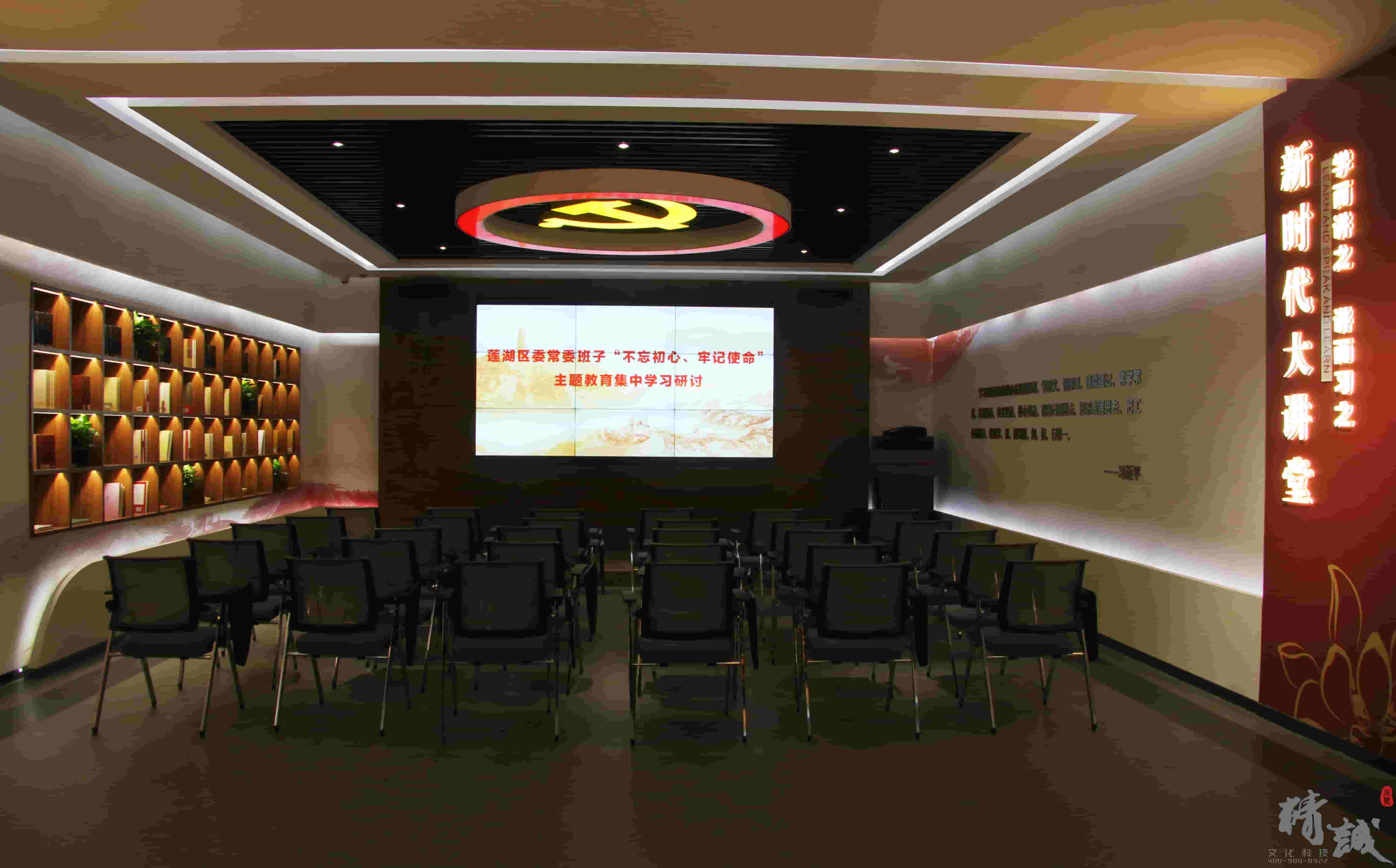 以“学而讲之、讲而习之”为主题,作为党员干部开展新时代中国特色社会主义思想学习的阵地,党员学习之后,在此开展自评、互评,亦可以邀请书记、专家、党代表授课。此空间设置讲台、座椅及用于授课的拼接大屏,吊顶采用巨型党徽,简约又不失大气。左侧墙壁内嵌式书架摆放党建读物,党员干部可自行阅览学习,右侧墙壁摘录中国共产党党员教育管理条例内容,和大讲堂党员教育性质相呼应。