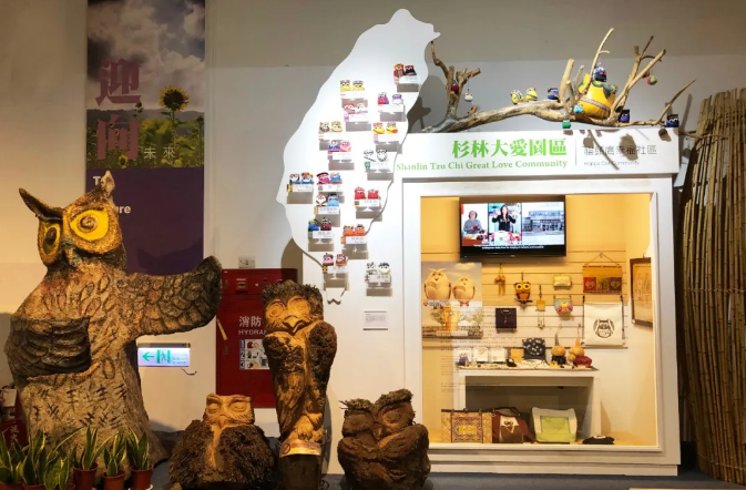 猫头鹰幸福社区:猫头鹰的木雕造型与现代橱窗相结合,橱窗是木板烤漆制作美食乡宴:竹屋的艺术造景橱窗里面陈列了各种乡下美食,通过玻璃隔断上的二维码,扫一扫可以进行线上购买,在这个展馆当中,没有设置线下的文创商店,都是通过这种橱窗展示,线上下单购买文旅商品,节省出更多的空间给展示功能区