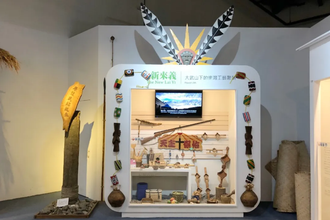 原住民展示区:原部落的造型图案与现代橱窗相结合,原始风味用了现代的手法进行表现,橱窗使用半高的透明玻璃进行隔断,防止游客触碰,并附有即时贴文字,进行介绍,二维码方便游客扫一扫更进一步的详细认知了解,橱窗内侧放置了一台显示器,滚动播放原始部落的视频内容