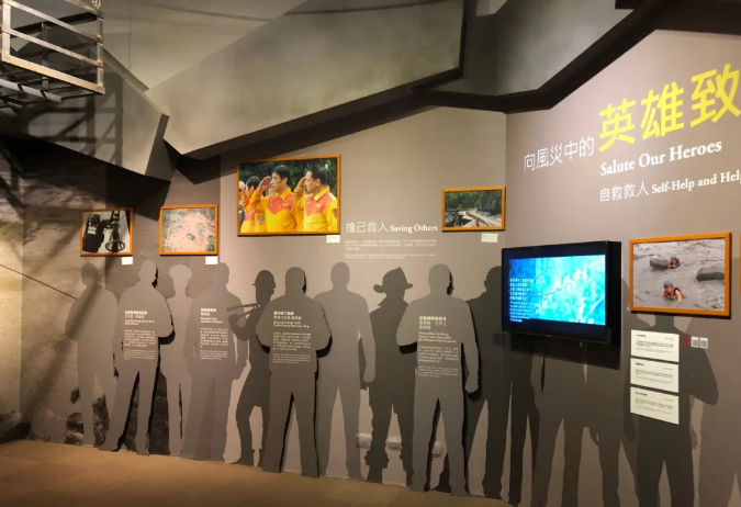 救援部队英雄:这里人物造景采用了虚实结合的方式,虚的人物部分与画面背景融合,统一油画布画面打印,实的人物部分是雪弗板UV雕刻打印,采用灰色调的背景人物形象,隐形表达这些是已经逝去的救援英雄,墙面彩色的照片框展示的是英雄们英勇救援的场景,色彩上的强烈对比,烘托出悲壮的环境艺术氛围